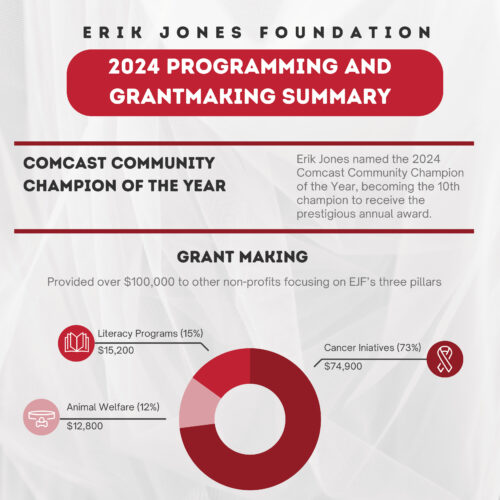 February 25, 2025 — The Erik Jones Foundation (EJF) is proud to announce the distribution of $85,000 in grants and donations to 15 organizations across the United States. This funding supports EJF’s three foundational pillars: igniting children’s passion for reading, encouraging early cancer detection and care, and promoting animal welfare. With this announcement, the foundation has surpassed $100,000 in grantmaking and charitable contributions in the past year.